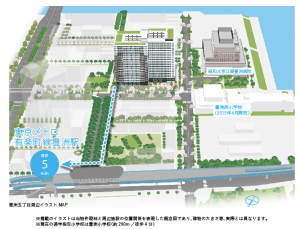 東西・南北には桜並木を配置する予定で、春には素敵な景観をつくりだしてくれそうです。22階建てで、一応タワーマンションの区分には入りますが、周辺は抜けていないため、眺望は期待できないだろうなぁと予想します。