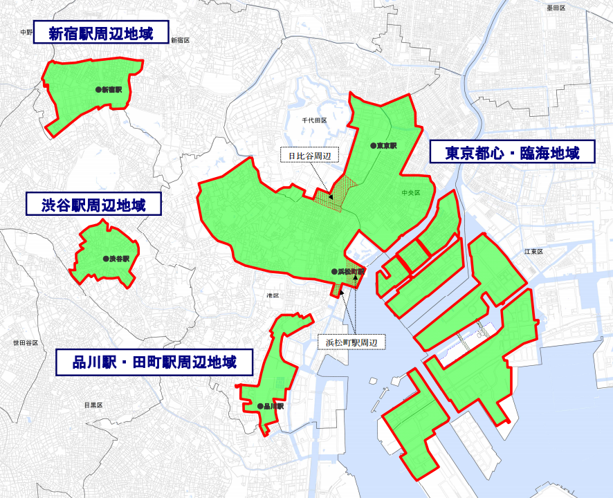 東京都では、新宿駅や渋谷駅の周辺、品川田町エリア、東京都心・臨海エリアがこの都市再生緊急整備地域に指定されています。