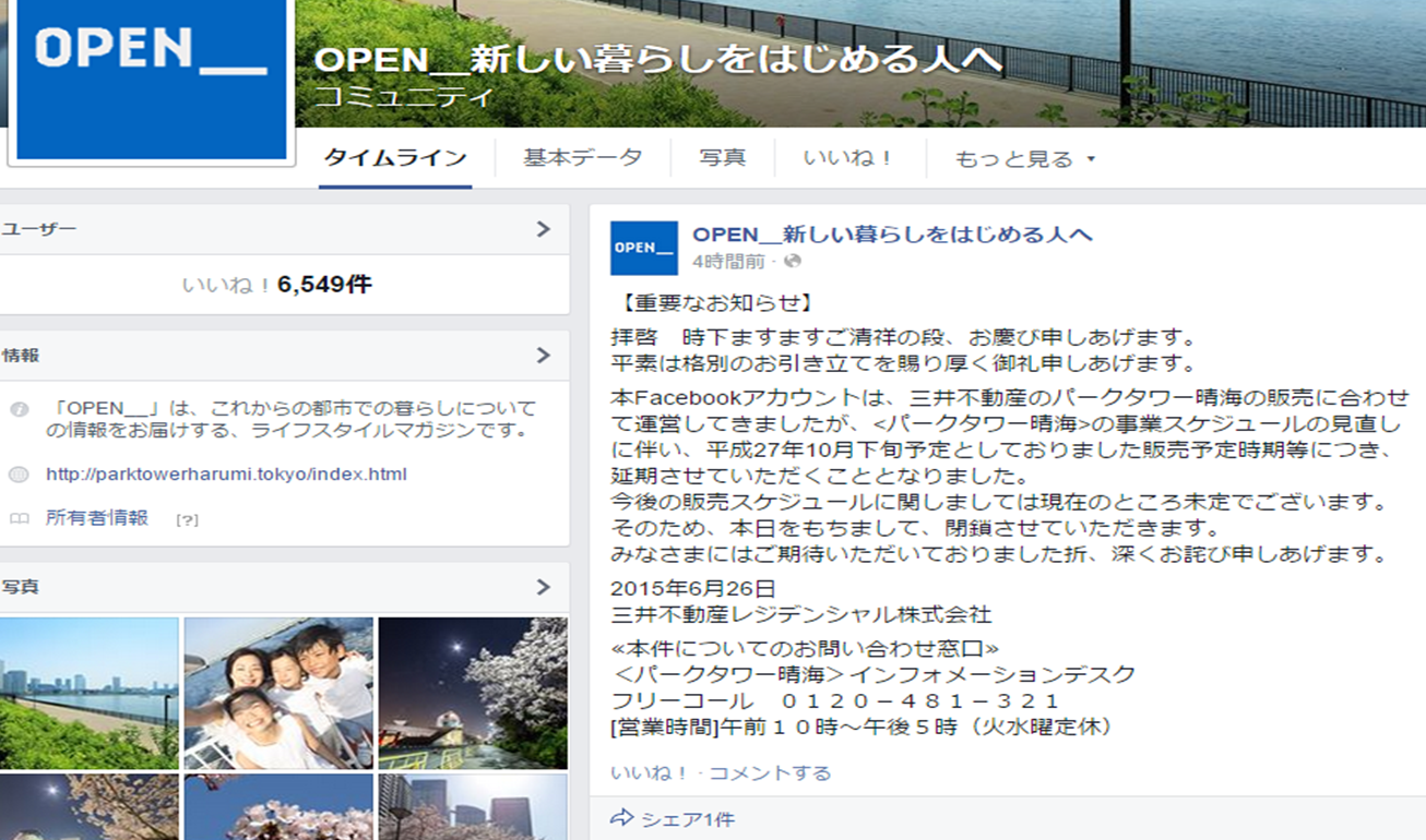 本Facebookアカウントは、三井不動産のパークタワー晴海の販売に合わせて運営してきましたが、<パークタワー晴海>の事業スケジュールの見直しに伴い、平成27年10月下旬予定としておりました販売予定時期等につき、延期させていただくこととなりました。