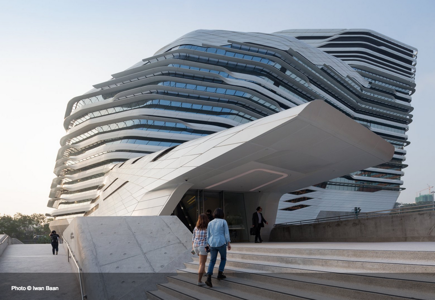2007年から着工し、2013年に完成した香港理工大学にあるジョッキークラブ・イノべーション・タワー。Photoshopで合成したイメージパースのようですが、これが実際の写真です。