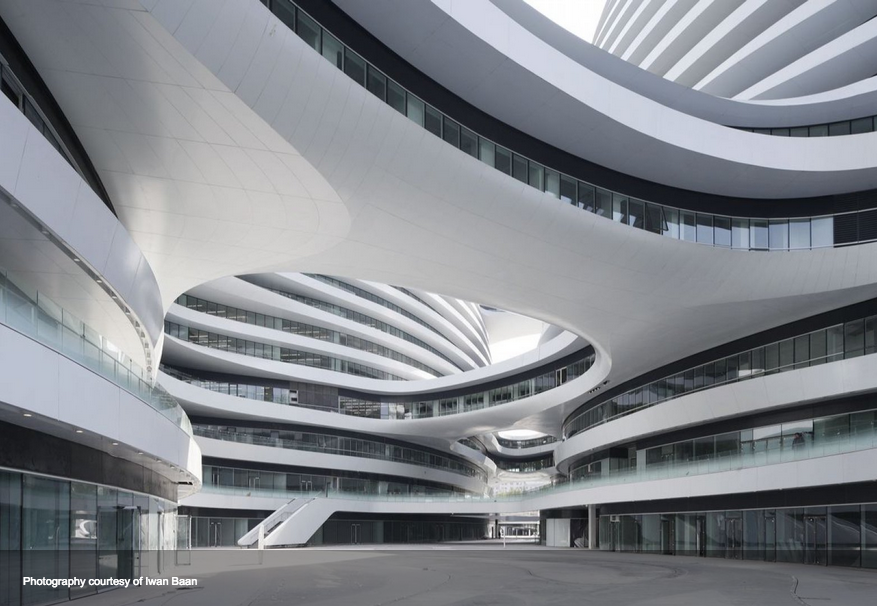 2012年、北京市中心部に完成した延床面積約330,000㎡に及ぶ巨大建築。オフィス、商業施設、エンターテイメント・コンプレックスを内包する建物は、地下3階・地上15階建て。4つのタワーを地上部に4つあるブリッジでつないでいます。中国ではよくメディアに取り上げられているとか。
