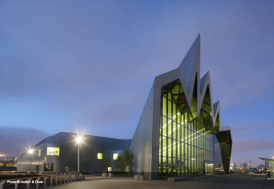 イギリス北部の街グラスゴーを中心に発展した自動車、造船、鉄道など輸送分野のエンジニアリングの進化の歴史をまとめた博物館として、2011年に竣工。天井がギザギザ(;゚Д゚)