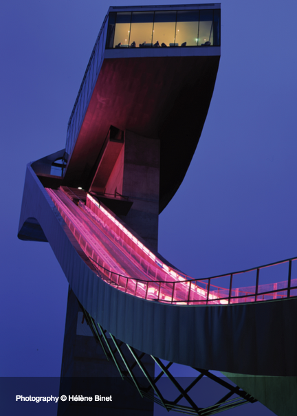 オーストリアにあるベルクイーゼル・スキージャンプ台。スキージャンプ台には見えないおしゃれな外観だけに目がいきがちですが、デザインだけでなく機能性もきちんと考えられており、この流麗で躍動的なフォルムの中に、カフェ、展望台、助走路などが融合されています。