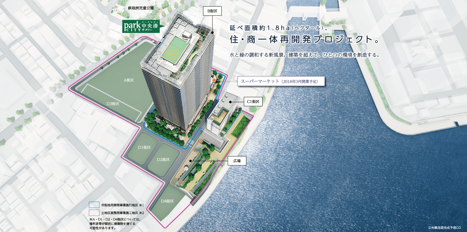 『パークシティ中央湊 ザ タワー』は、この湊というエリア内の、約1.8ha(ヘクタール)の広大な土地区画整理事業と市街地再開発の一体開発からなる、中央区内陸”初”の大規模再開発プロジェクトです。