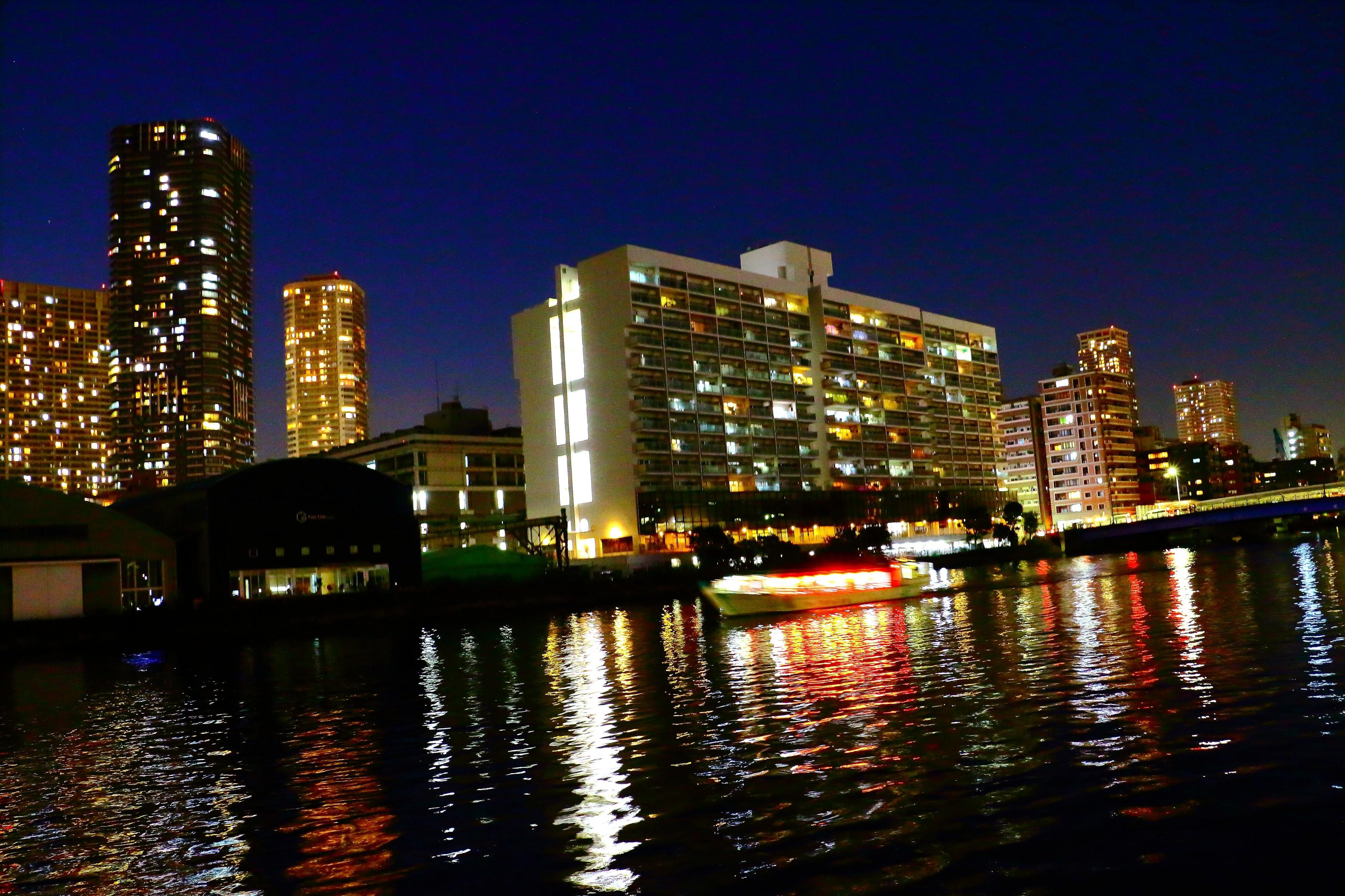 夜の朝潮運河も素敵ですね。屋形船がいい雰囲気出してます・・・