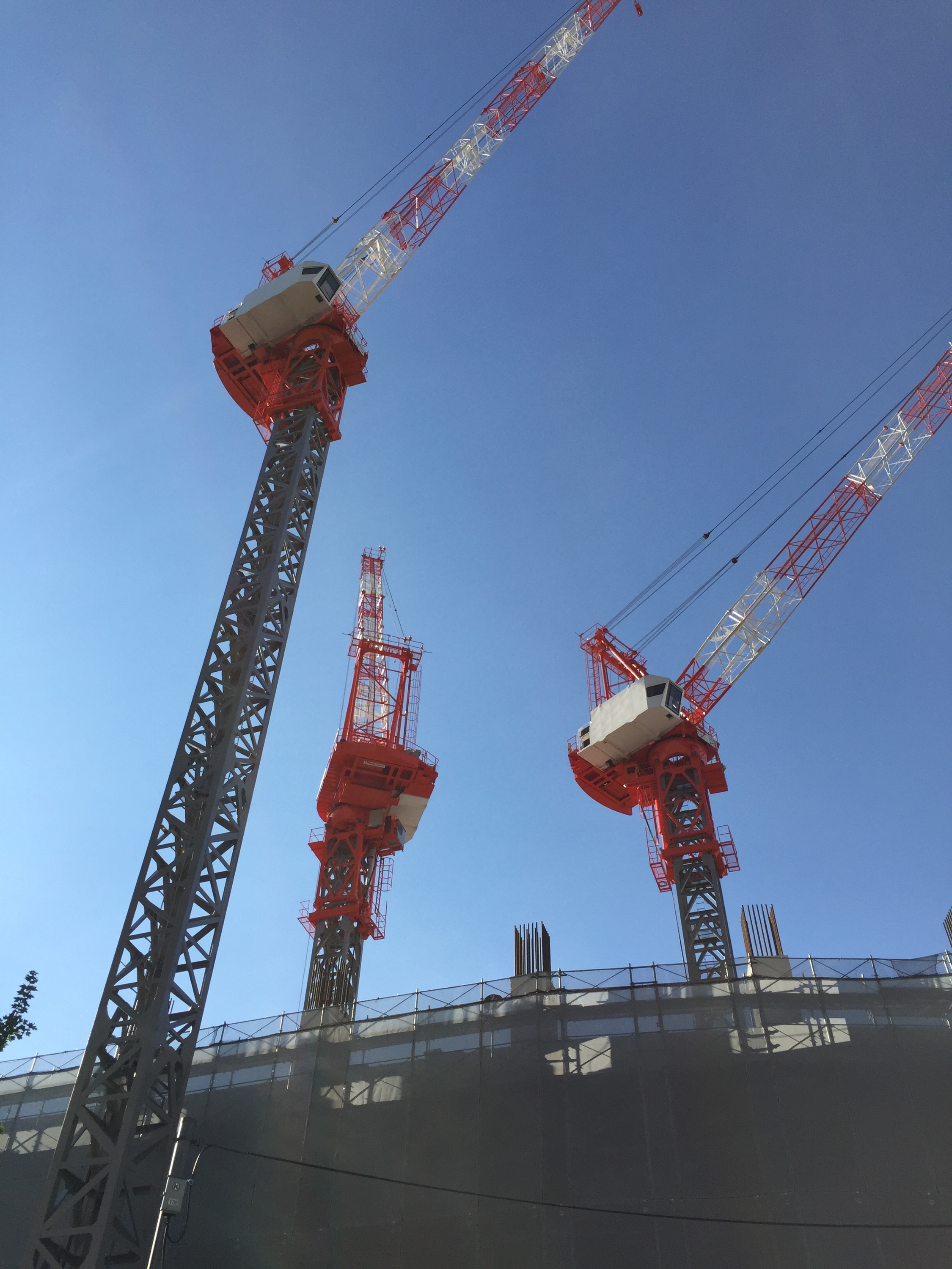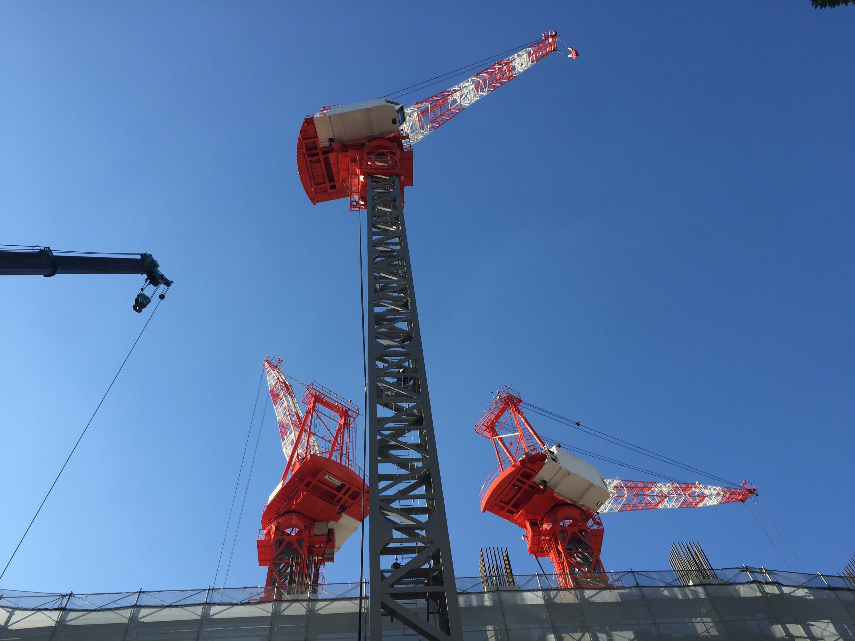 秋晴れに映える、3機のタワークレーン