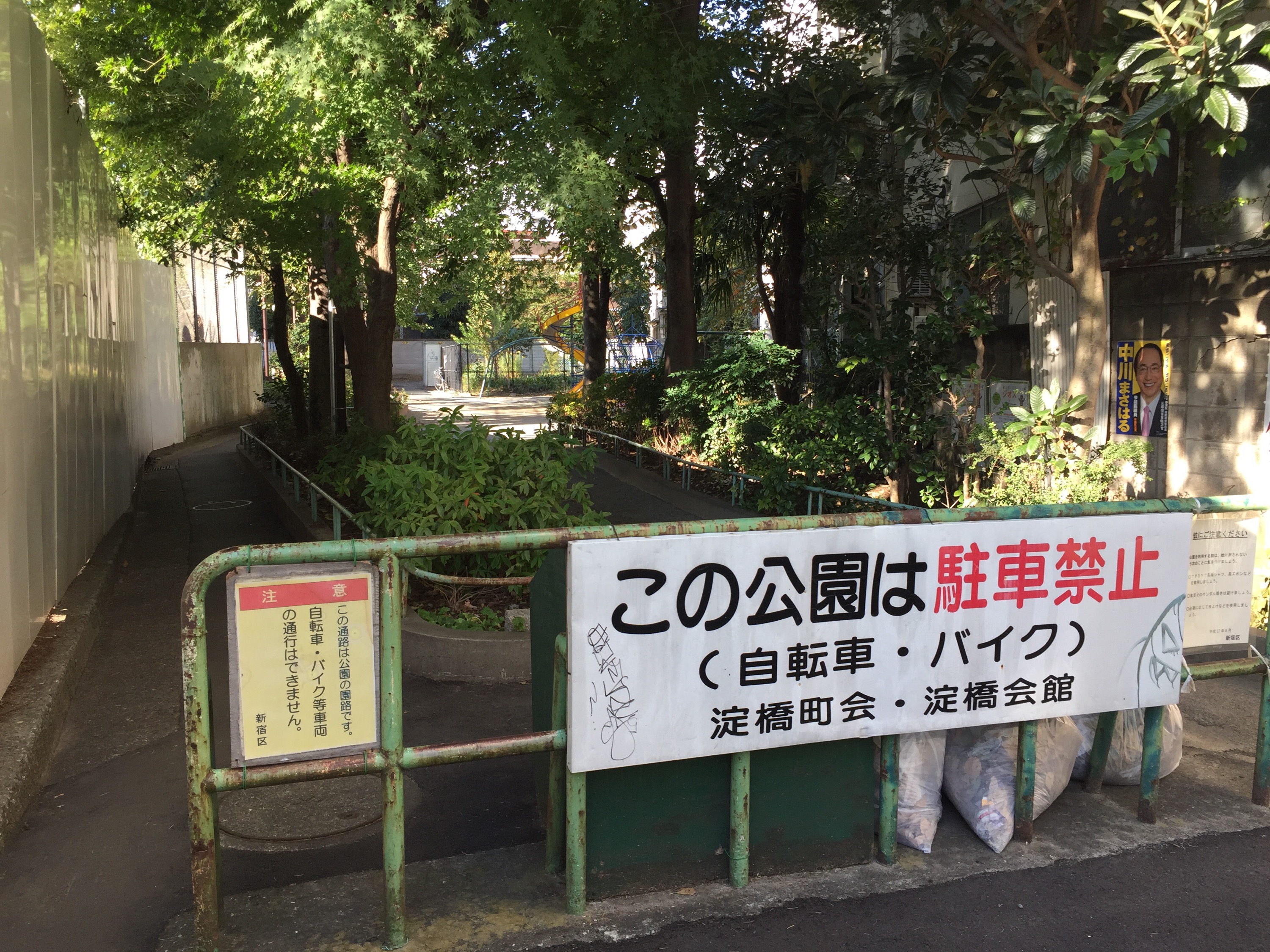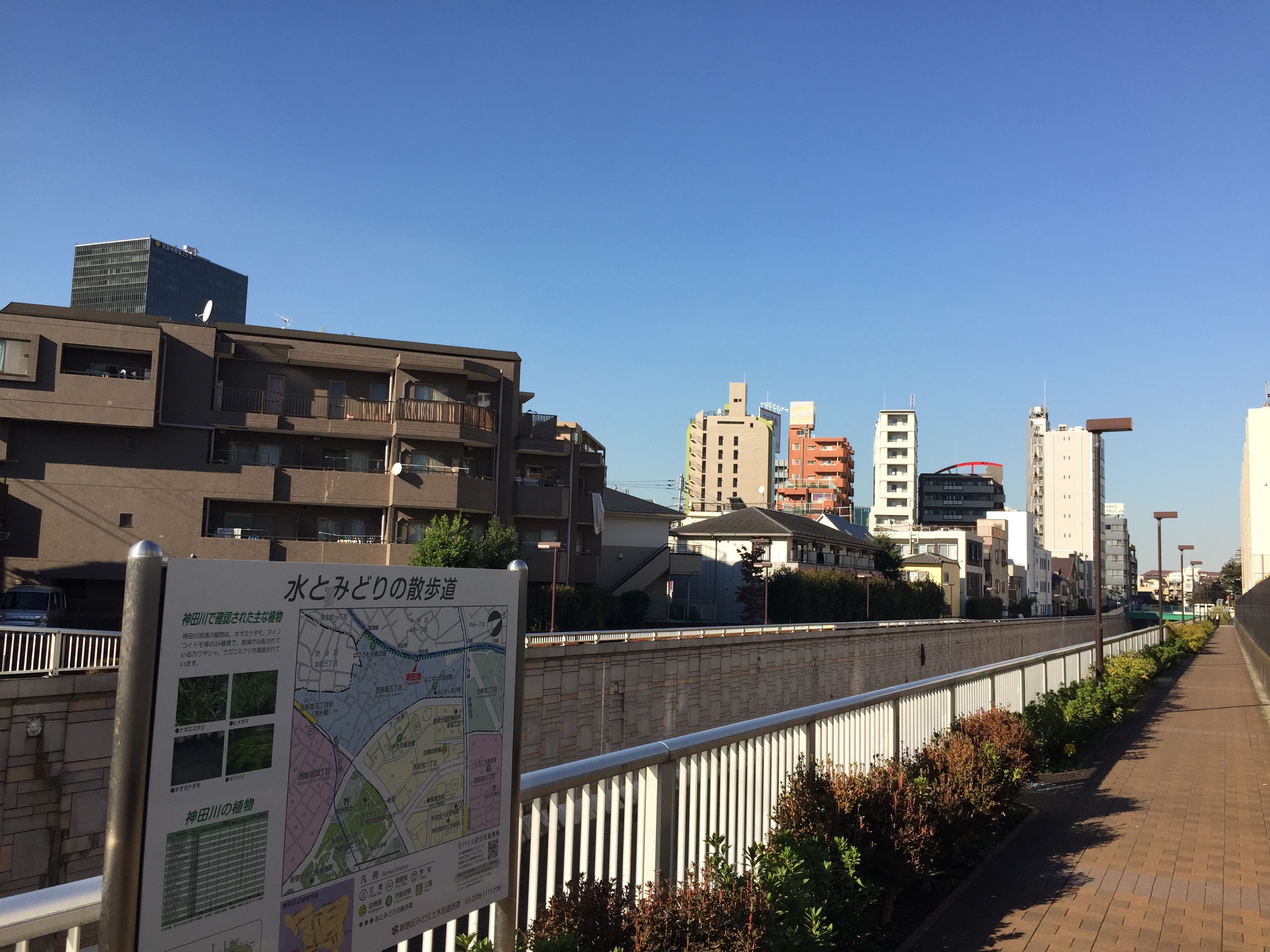 西側の神田川沿いの「水と緑の遊歩道」。あまり緑があるようには見えませんが・・・