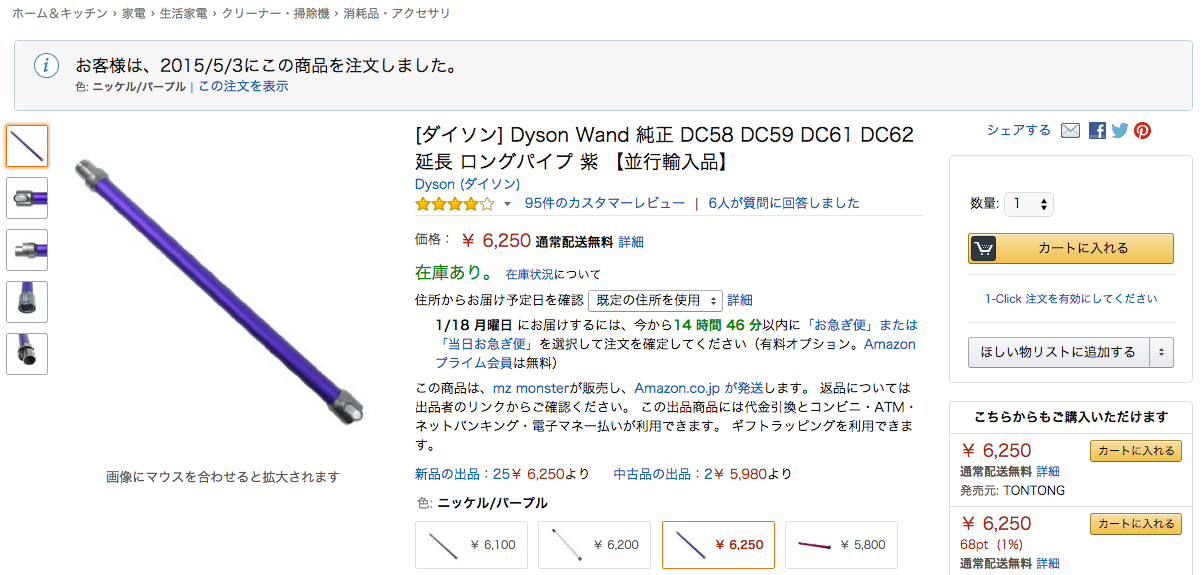 [amazonjs asin=”B00KQQV4MG” locale=”JP” title=”Dyson(ダイソン) 純正延長ロングパイプ DC58 DC59 DC61 DC62 パープル 並行輸入品”]