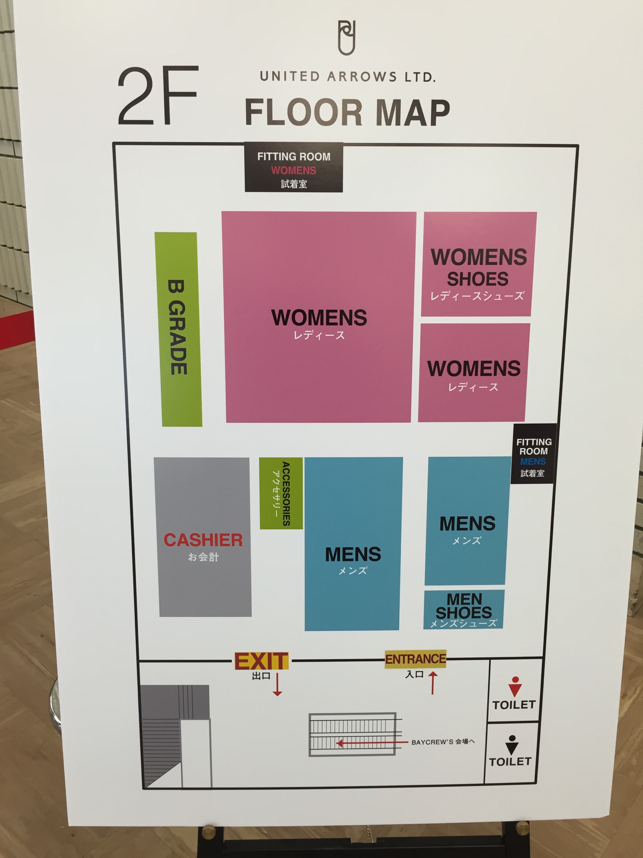 ベイクルーズ(ジャーナルスタンダードやエディフィスなど)のファミリーセールとの合同開催で、展示会場2階部分が「ユナイテッドアローズ」のファミリーセール会場となっています。