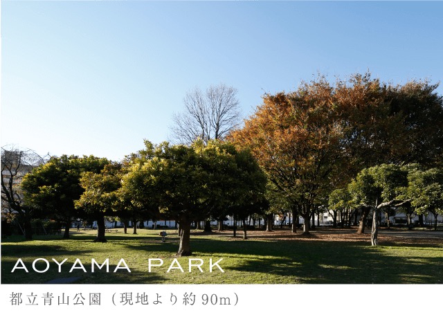 マンションの目の前に位置する「青山公園」は、結構広いので子供とキャッチボールをして遊んだり、レジャーシートを広げてお昼寝など、ファミリーでゆったり楽しめる、緑に癒されるとても気持ちの良い環境です。