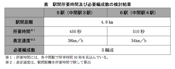 運行ダイヤは、運行間隔を他の既存の東京の地下鉄路線を参考に、4分間隔で運行することで想定し、速度及び車両編成を算出したようです。