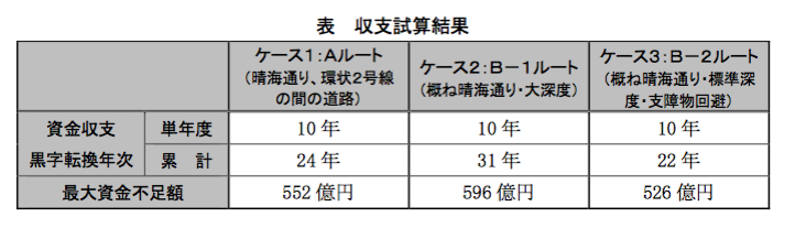 終始結果を見てみると、B-2ルートが黒字転換まで22年で一番採算が取りやすいルートになりそうです。ただし、B-1ルート(首都高延伸が決まり、深くまで掘る必要がある場合)になってしまうと、黒字転換まで31年となってしまい、実現度が遠のきますね。