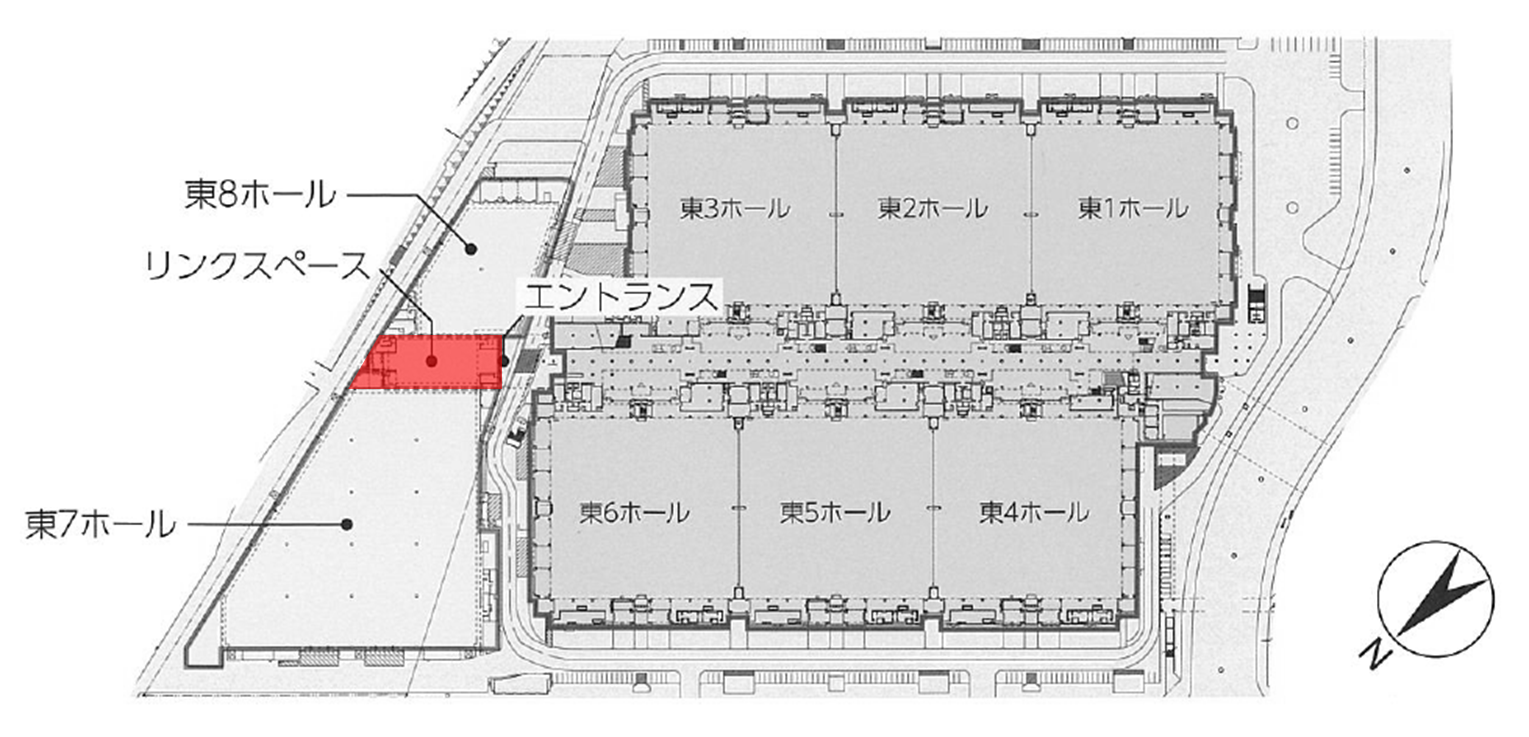 実際のイベント時、来場者の流れとしては、エントランス ⇒ リンクスペース ⇒ 東7・8ホール という流れになります。