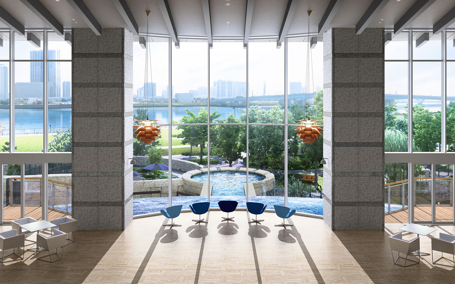 高い天井まで伸びた、南面のガラスからは、広大な晴海運河を望むことができます。