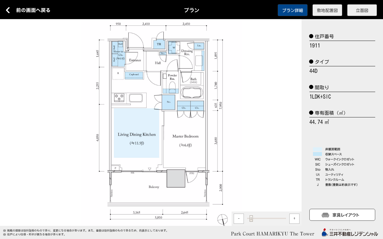 1911号室 44.74平米 1LDK 6790万円(坪単価502万円)